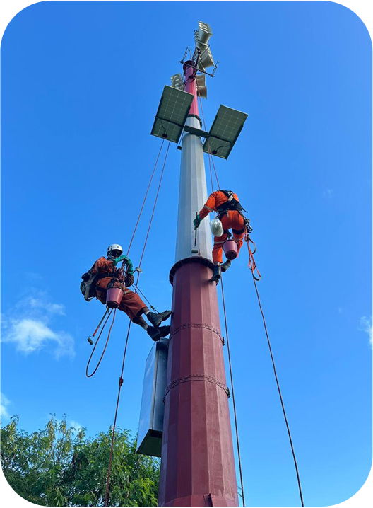 Com técnicas de acesso por corda, é possível alcançar pontos críticos sem interrupções, realizando pequenos reparos, substituição de componentes, verificação de para-raios, aperto de parafusos e inspeção visual minuciosa. Cada etapa segue protocolos rígidos, permitindo identificar desgastes, corrosões, desalinhamentos e qualquer falha estrutural antes que se torne um problema maior.